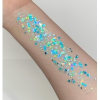 "Blue Monday" offers a blended mix of chunky sizes of holographic blues with hints of green including fine glitters, offering a glamorous, princess royal, oceanic or fairy-like effect.  A lovely accent to your makup or face paint design.