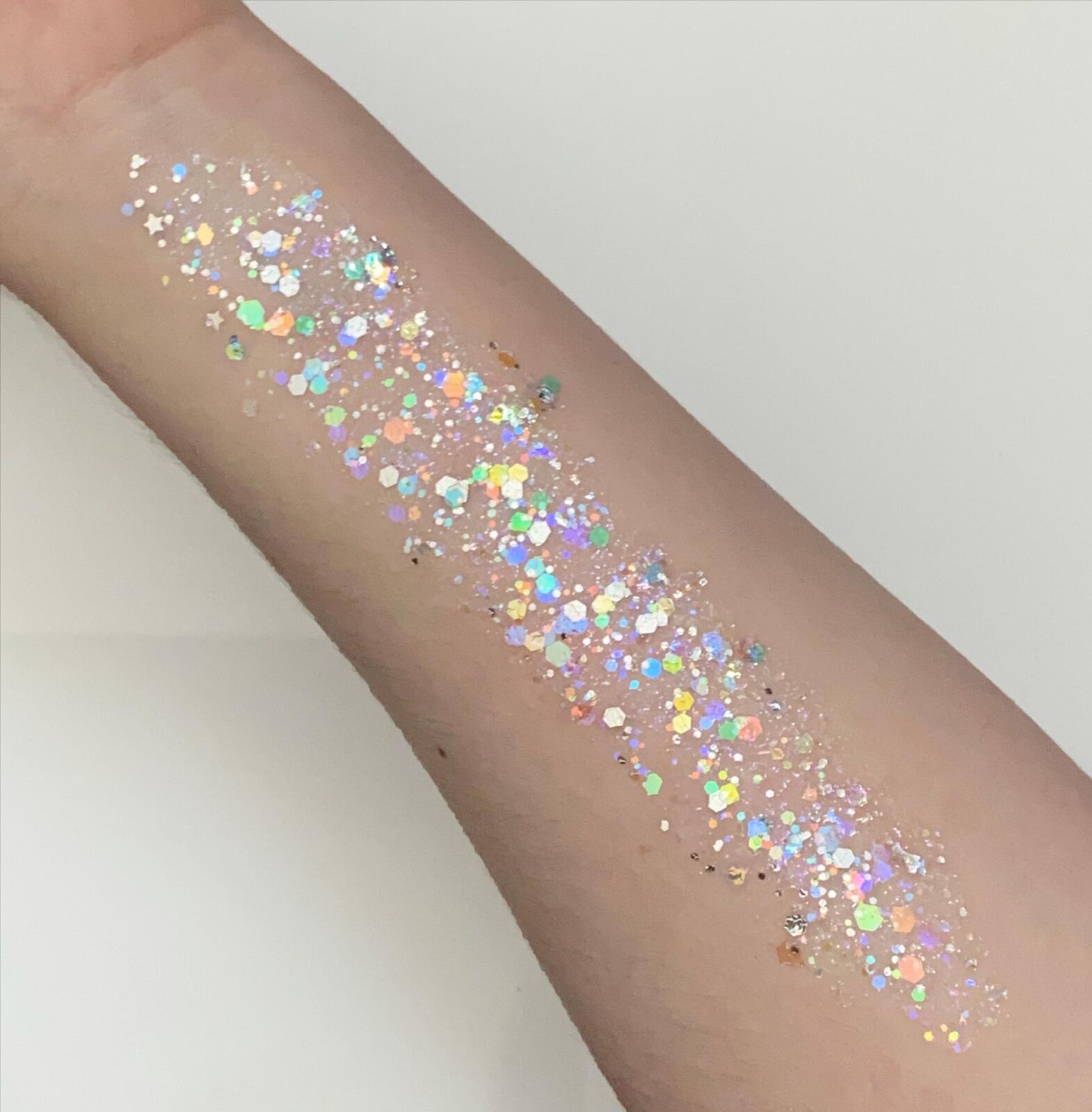 Please use caution when using large glitter particles on the face. It is not recommended to use large glitter particles (of any shape or material) near the eyes.