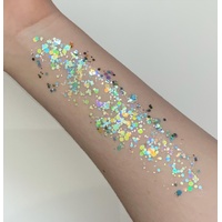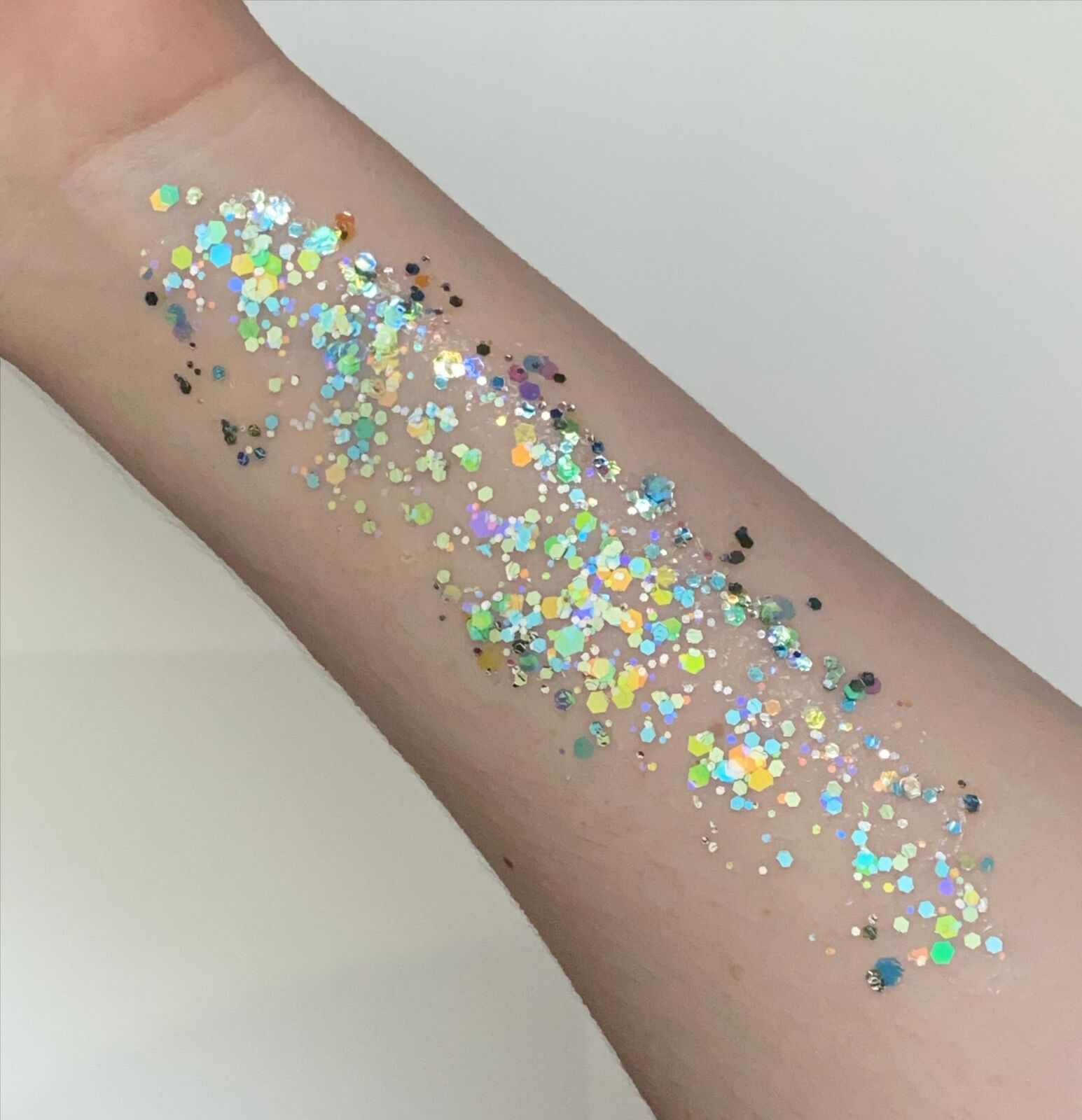 "Splash" offers a blended mix of chunky sizes of holographic pale blues and greens perfect for mermaid or aquatic-themes. A lovely accent to your makup or face paint design.