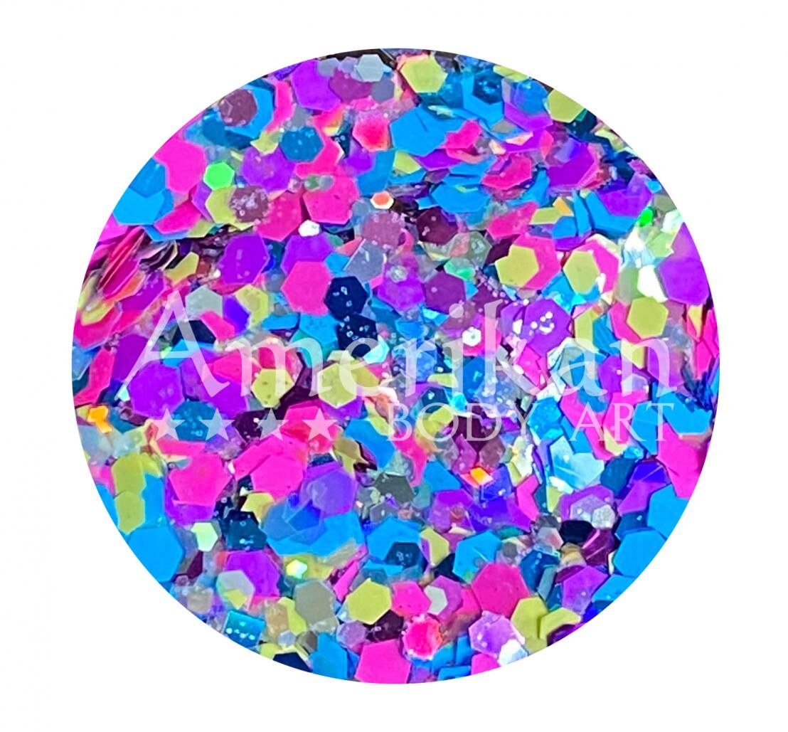Amerikan Body Art Chunky Glitter Blend - Felicity UV Neon Glow Pink, Yellow, Purple, Blue, Silver - 1oz (approx 28g)