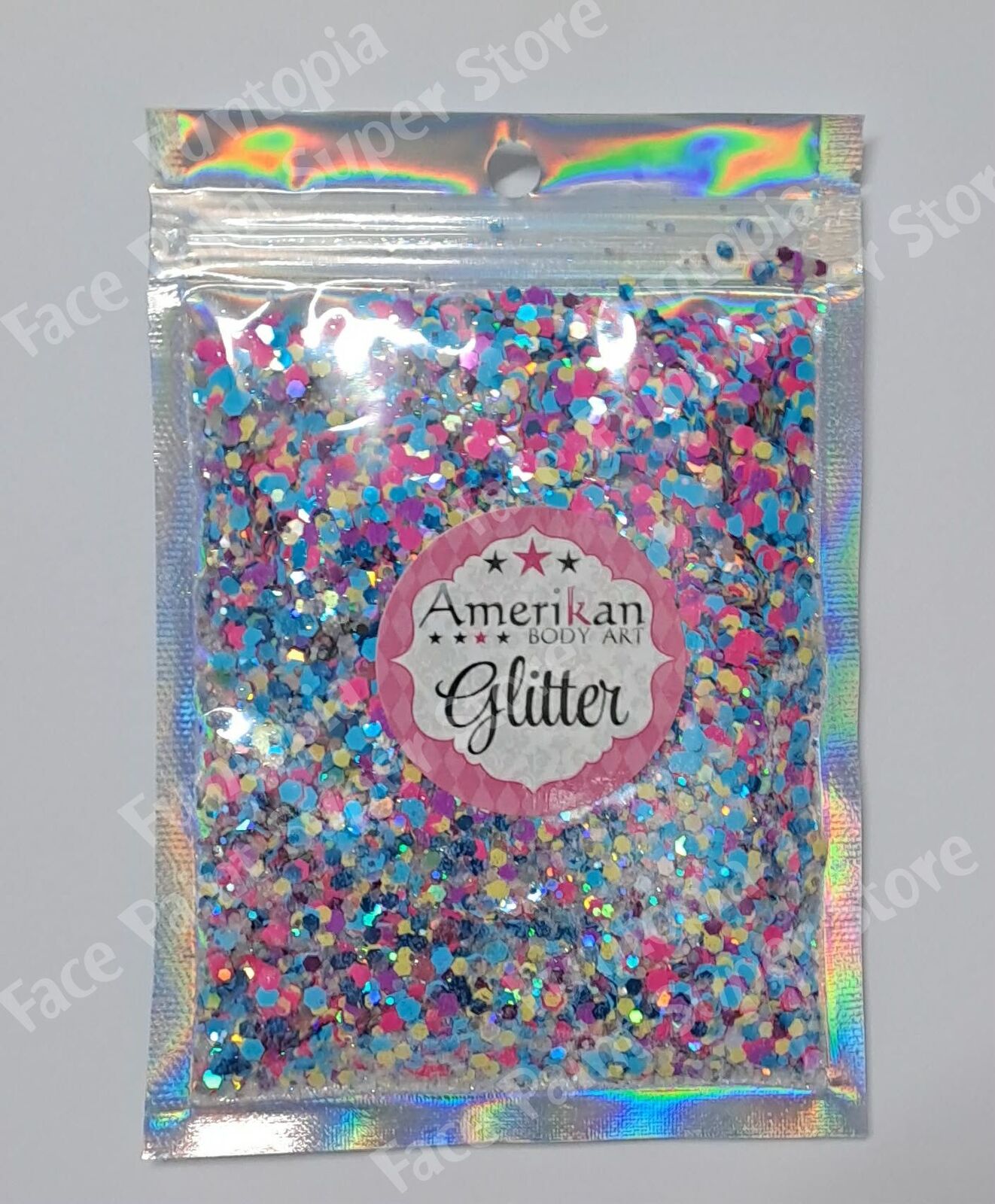 Please use caution when using large glitter particles on the face. It is not recommended to use large glitter particles (of any shape or material) near the eyes.