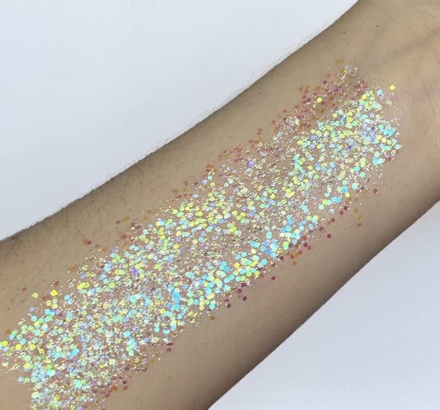 "Illumine" offers a blended mix of chunky sizes of iridescent white with reflective pink hues providing a delicate, ethereal glow.  It picks up rainbow colours with reflective light. A lovely accent to your makup or face paint design.