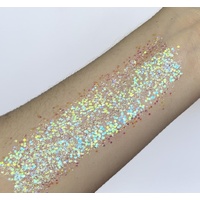 "Illumine" offers a blended mix of chunky sizes of iridescent white with reflective pink hues providing a delicate, ethereal glow.  It picks up rainbow colours with reflective light. A lovely accent to your makup or face paint design.