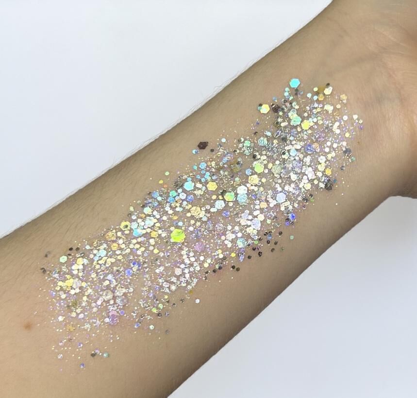 Please use caution when using large glitter particles on the face. It is not recommended to use large glitter particles (of any shape or material) near the eyes.
