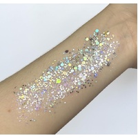 "Voyager" offers a blended mix of chunky sizes of holographic Silver and Soft Gold shimmer colours. A lovely accent to your makup or face paint design.