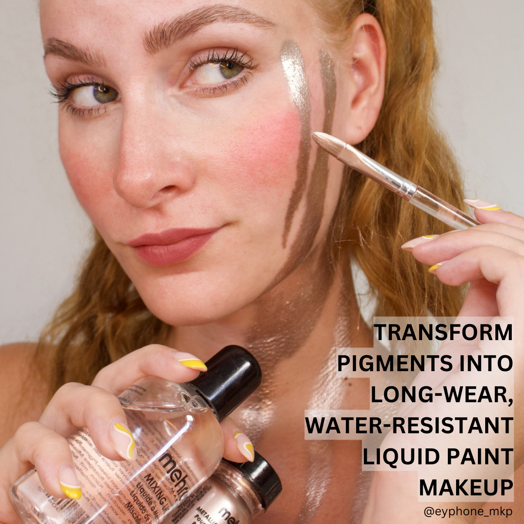 Mix a small amount of Mixing Liquid with pigments like Precious Gem™ Powder or Metallic Powder to create an opaque, long-wear liquid makeup. Apply the mixture with a brush or sponge. To create long-wear airbrush makeup combine Mixing Liquid with Liquid Makeup to run through an airbrush. Remove with soap and water.
